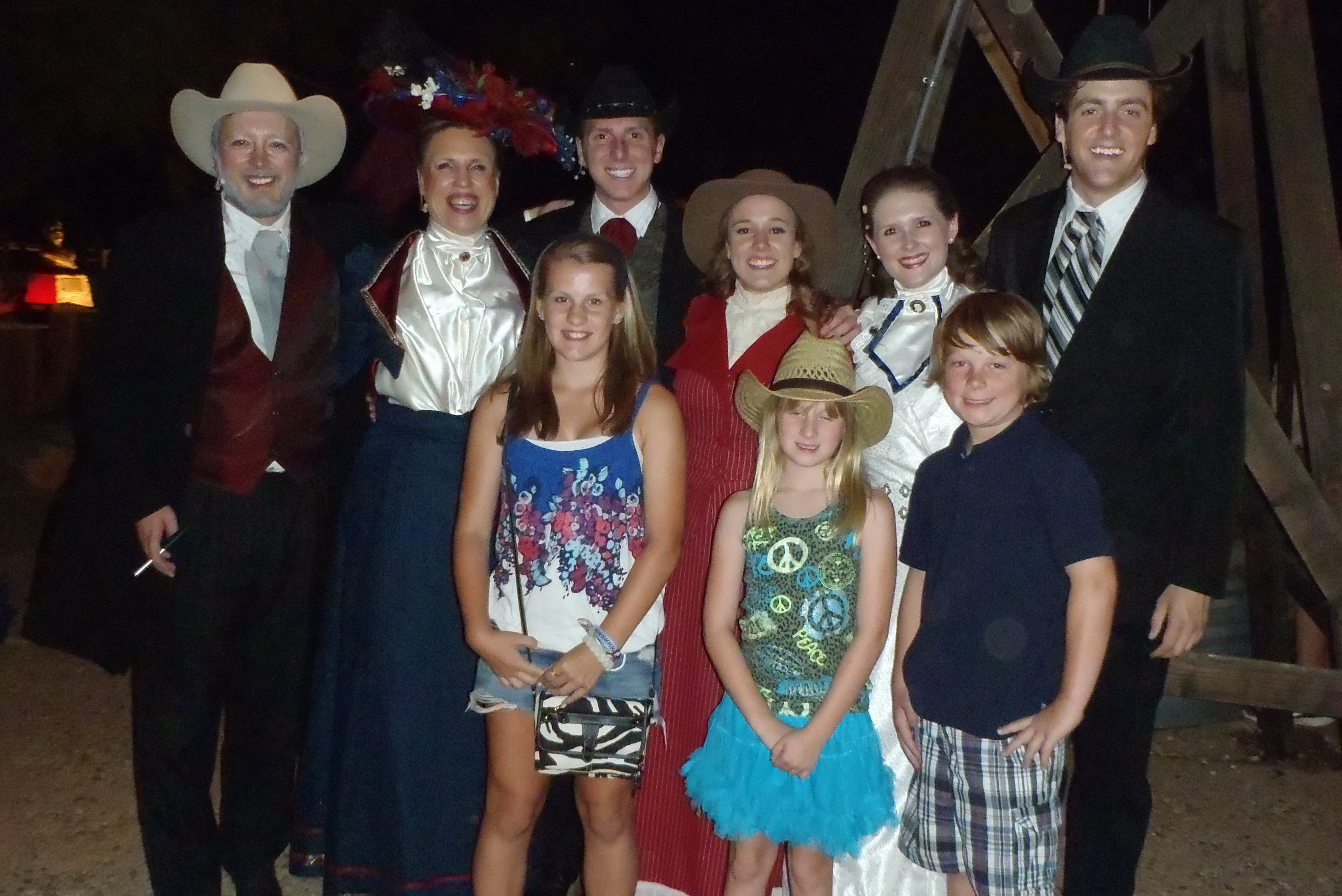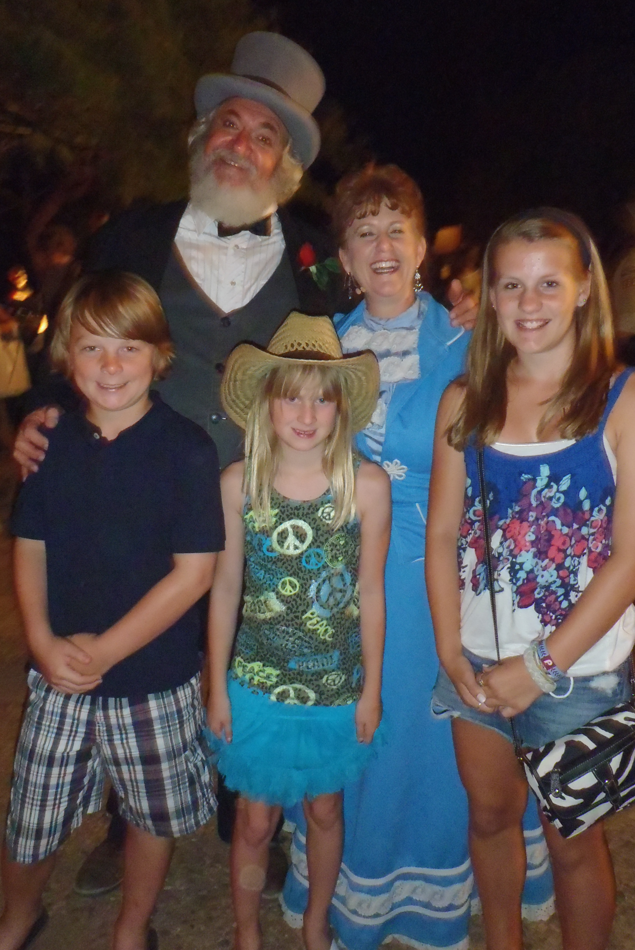 It told of the settling of the panhandle and Palo Duro Canyon. There were live horses and lightning strikes and lots of great music. At the end, they did a Fourth of July tribute to service men.ย  They brought out the flag for each service branch and had anyone who served stand. The kids were very proud to see their father among the men who stood. Unfortunately, because of drought conditions, there were no fireworks, however, they did a nice job with a lights and water spectacular. On the way out, the kids got pictures with the 8 main characters.