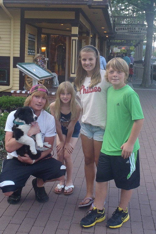 We went into Durango for their 4th of July parade-a cute, small town affair after which, Main Street was closed down to car traffic and they set up an old fashioned block party, complete with a band, dancing and lots of good food. Joe met us at the party with a surprise in tow, his new puppy, Jack, an adorable St. Bernard/Border Collie mix that the kids fell in love with instantly.