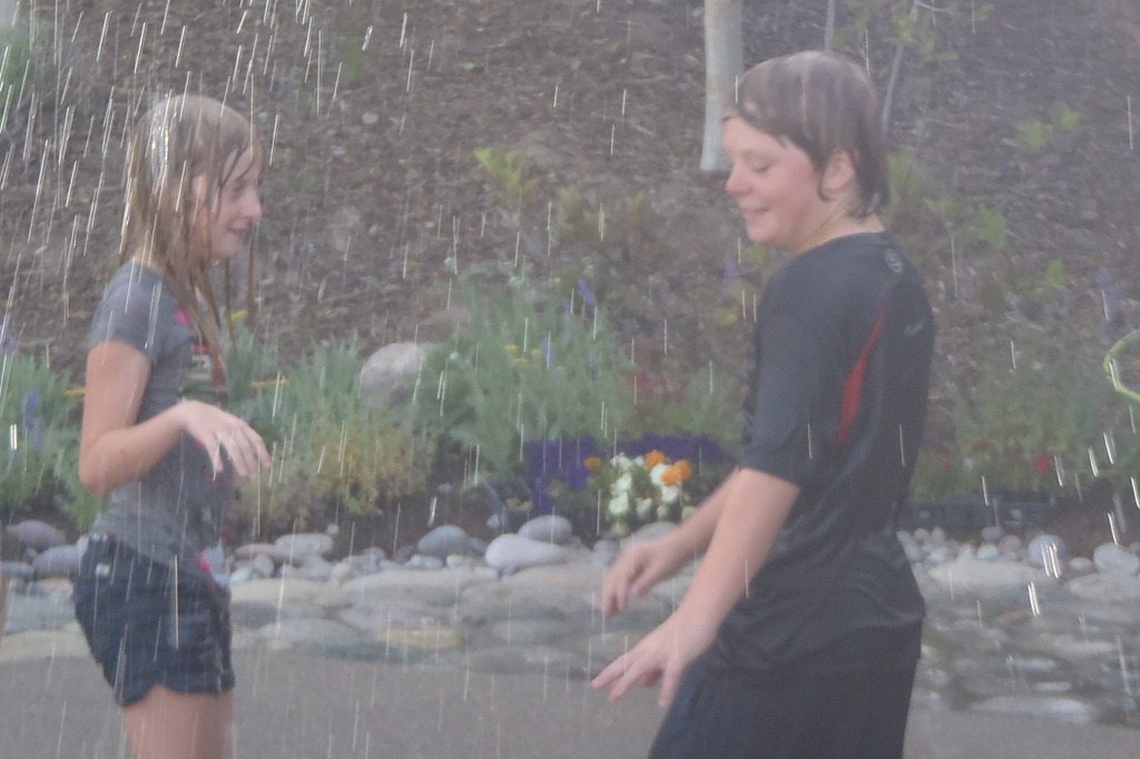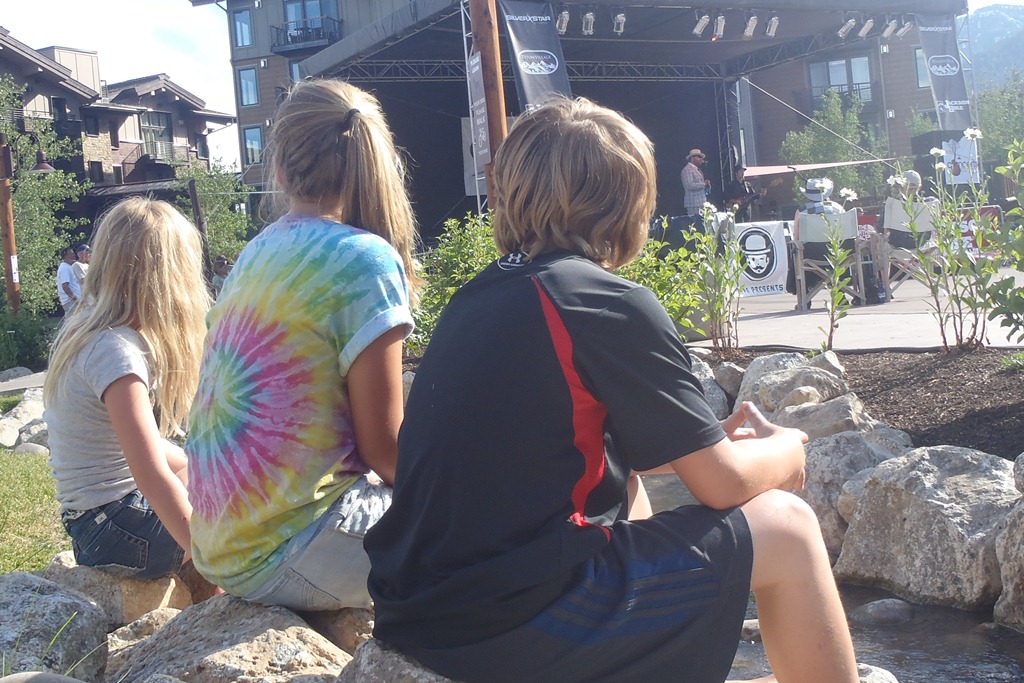 We spent our first night in Jackson Hole, Wyoming visiting Teton Village. We found out that there was a concert in the square and took the kids over to see what it was all about. We sat and watched the sun set over the Teton Mountains. There was snow on the peaks but as it was warm, Jeff and I sat and listened to the band and the kids splashed in the little stream that ran through the village, and an area of the square that had water sprinklers that shot out of the ground. It was a relaxing way to start our visit.