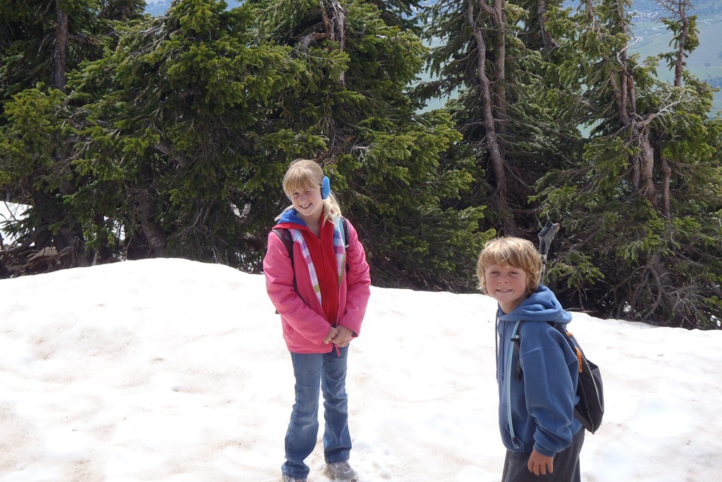 Because the peak was snow covered, the kids donned hats and mittens to throw snowballs, something we can’t usually do in July. We took the tram back down the mountain and had lunch at the base.